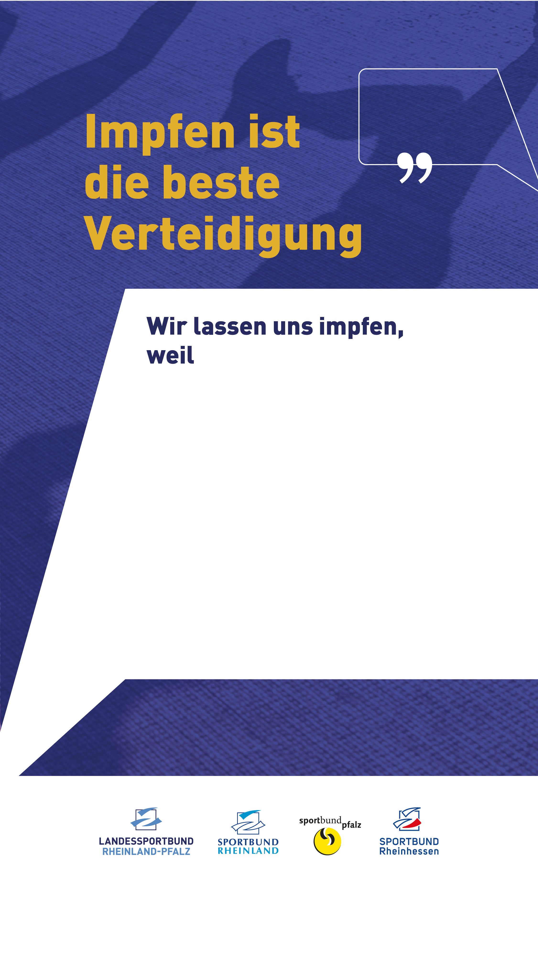 Verteidigung klappt nur zusammen. Werden Sie Teil der Kampagne "Impfen ist die beste Verteidigung" des rheinland-pfälzischen Sports: Laden Sie sich unserer individuell gestaltbares Plakat herunter, platzieren dieses mit Ihrer Impf-Botschaft im Umfeld ihres Vereinsgelände und sensibilisieren Sie ihre Mitglieder für eine Impfbereitschaft oder bewerben Sie ihren mit der Sportjugend Rheinland-Pfalz koordinierten Impftermin. Auch über Social-Media können Sie Teil der Kampagne werden und sich unser selbst ausfüllbares Story-Template herunterladen und entsprechend mit Ihrer Botschaft, Bewerbung der Impfstation teilen. Verlinken Sie dazu den Kanal des Landessportbund @landesportbund.rlp und verwenden den Hashtag #impfenistdiebesteverteidigung.